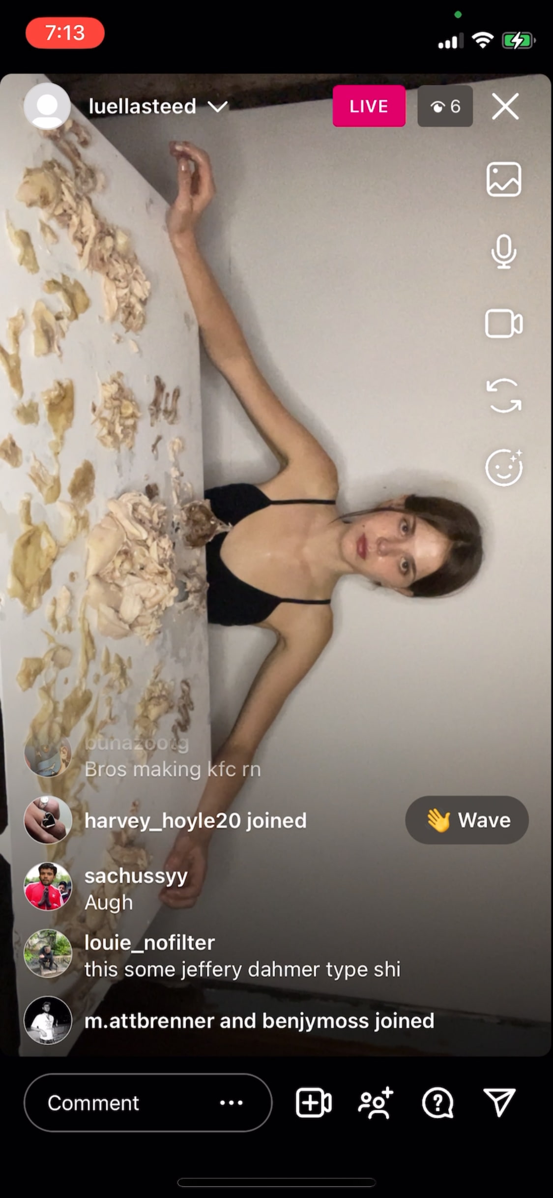 Luella Steed is a 22 year old multi-disciplinary artist who specialises in performance, illustration and sculpture. I first met Luella whilst walking the same runway in 2022 and have watched her from afar develop into one of the most promising artists the contemporary London scene has to offer. Her work, centred around a kind of visceral dedication to human connection, is vulnerable, often confusing and terribly unique. At its hearts it invites her audience, at least in my opinion, to play, to laugh but most importantly to pay attention. Through her work we see reflected back at us the fragmented oddities of the social and (un)natural world around us, its unlikely collisions and provocations. Her use of live streaming as a medium for performance is as equally brilliant as it is distinct, and represents a truly affective example of the nuanced creative potential new forms of technology can offer the arts. After taking a year out to work on scenic painting in the film industry, she is about to begin her third year at CSM. We talked openly and honestly about her influences, her choices of form and her aspirations for the future.